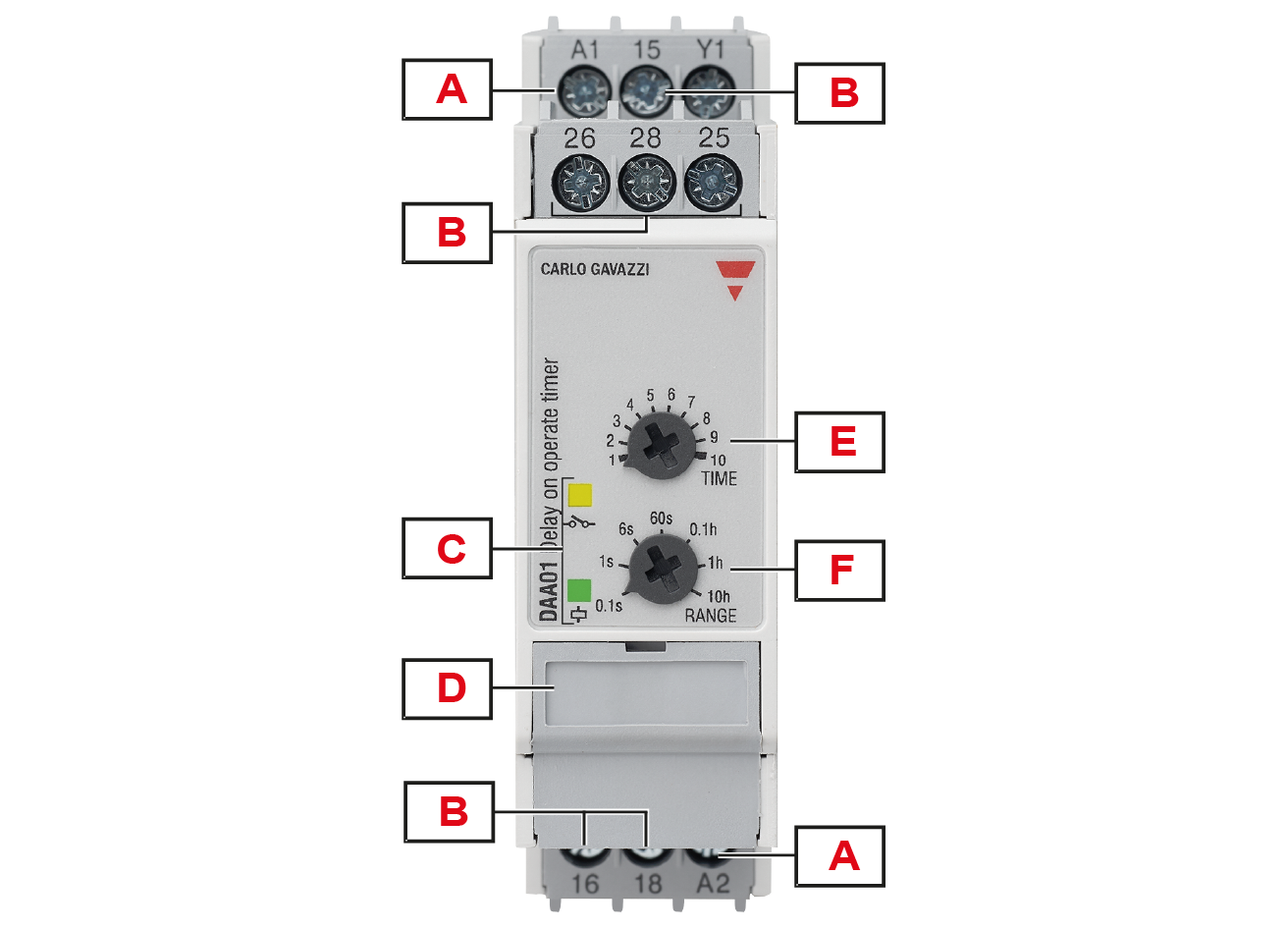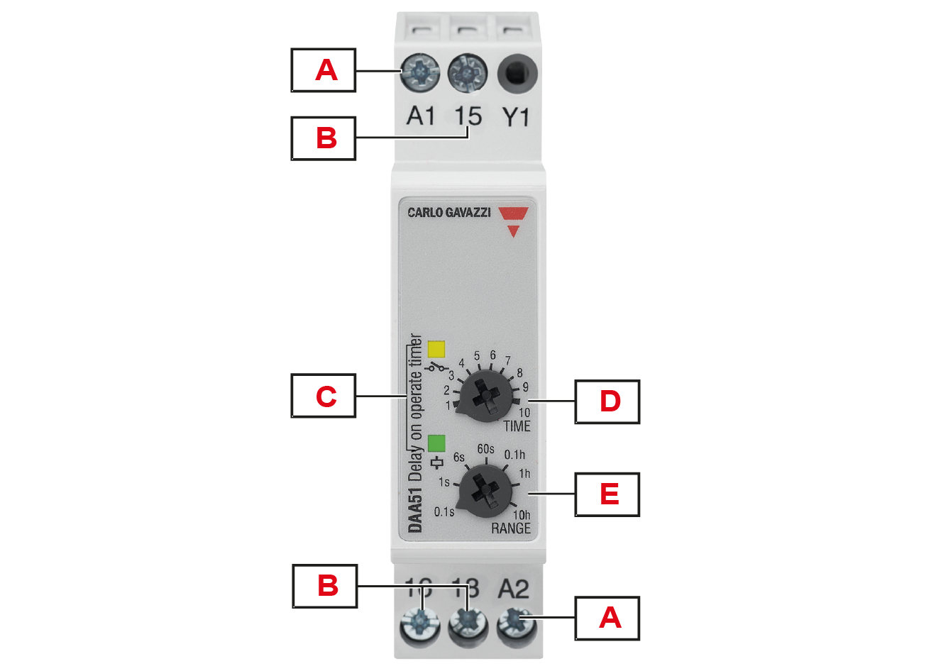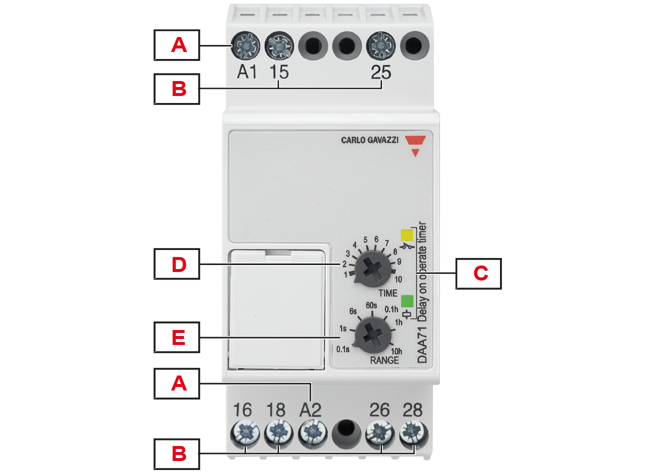 Each terminal can accept up to 2.5 mm2 wires for DAA51 and DAA71, and 2 x 2.5 mm2 wires for DAA01. |