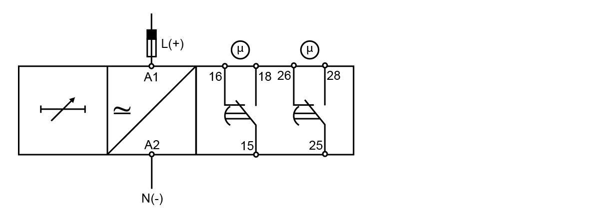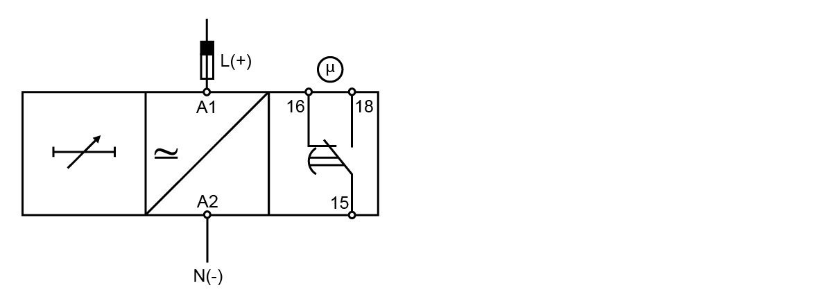 The set delay period begins as soon as the power supply is connected. At the end of the set delay the relay operates and does not release until the power supply is interrupted for at least 200 ms. If the power supply is interrupted for at least 200 ms before the relay operates the time is set to zero and the circuit is ready for a new time period.