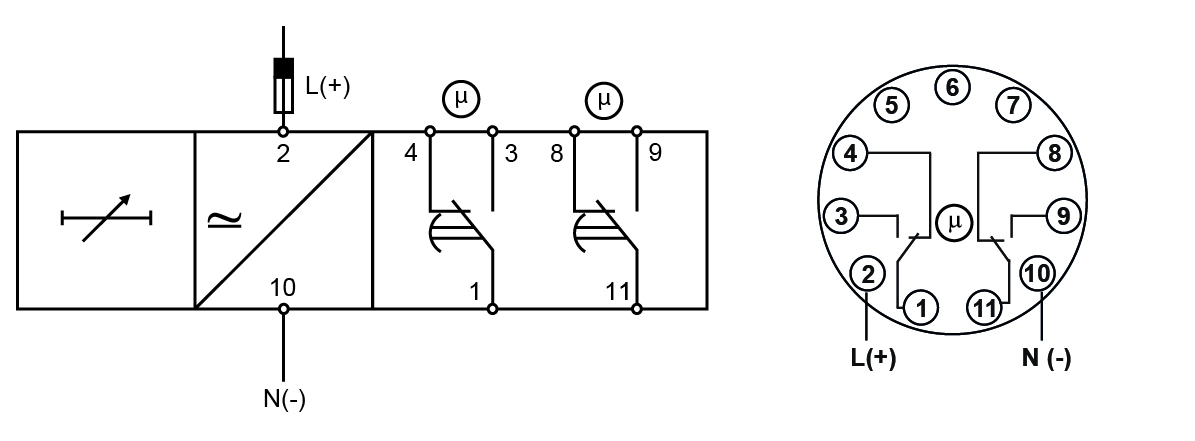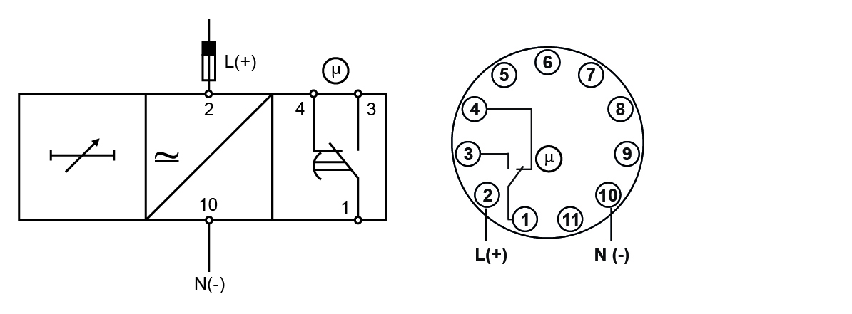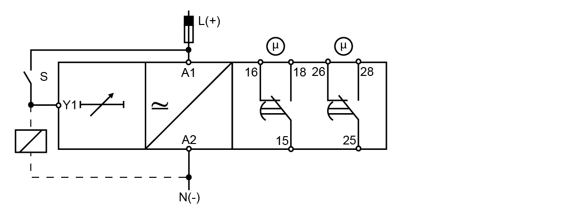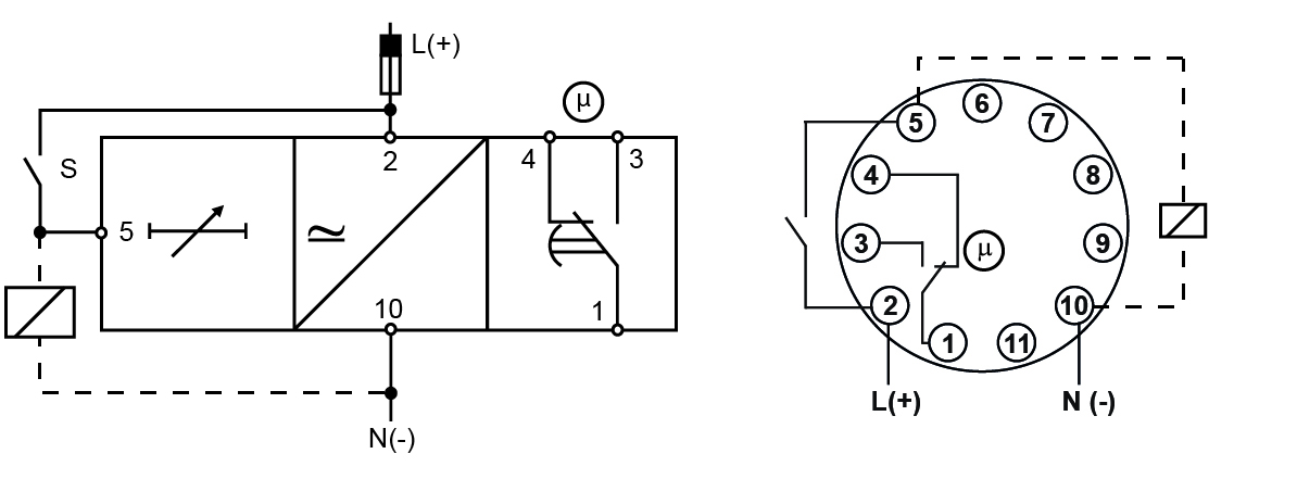 At the end of the set delay or when the power supply is disconnected the relay releases.